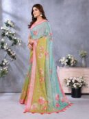 Elevate your ethnic collection with the beautiful Green & Aqua Floral Print Linen Shimmer Saree. This saree is a perfect blend of modern style and traditional grace, featuring a serene mix of green and aqua shades with a subtle, shimmering effect. The delicate floral prints add a touch of natural elegance, while the bold, contrasting peach-pink border and tassel detailing provide a vibrant pop of color.
