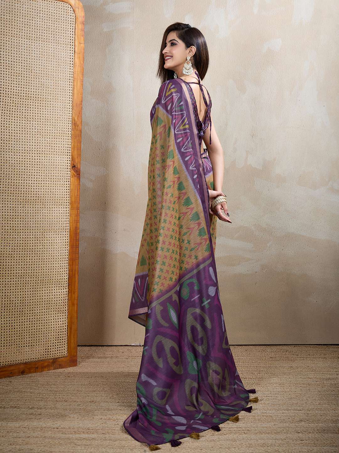 Elevate your ethnic collection with the Olive & Purple Ikat Printed Chanderi Saree. Crafted on a rich olive green base, this saree is adorned with striking purple Ikat-inspired motifs and an artistically designed pallu featuring geometric and floral accents.